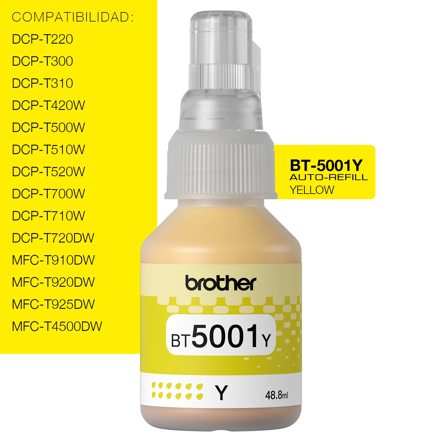 La Brother BT5001Y es una tinta amarilla original para sistemas de tinta continua, con rendimiento de hasta 5.000 páginas y colores intensos, compatible con impresoras Brother DCP-T y MFC-T.